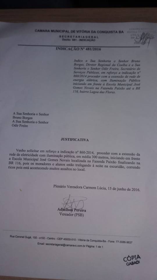 Através da indicação nº 860/2014 e de autoria do vereador Adinilson Pereira (PSB), a Prefeitura Municipal de Vitória da Conquista fez a extensão de rede para iluminação pública de aproximadamente 300 metros, iniciando em frente à Escola Municipal José Gomes, localizada na Fazenda Paixão, no bairro Lagoa das Flores, até a BR 116.